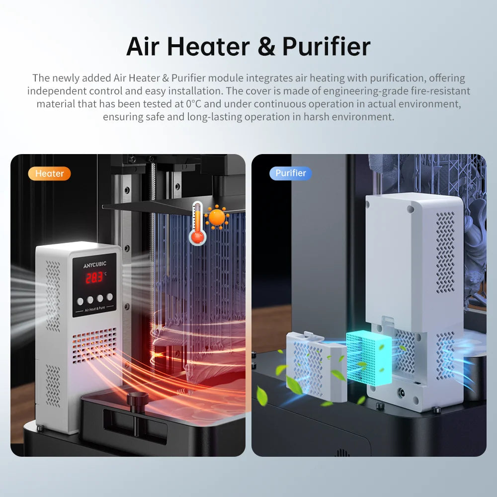 The built‑in Air Heater & Purifier system keeps the ambient temperature up to 40 °C and the resin above 20 °C, ensuring consistently sharp prints even in colder rooms — while reducing odors during operation